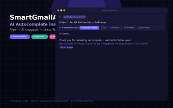 SmartGmailAI adalah ekstensi gratis yang dirancang untuk meningkatkan produktivitas pengguna Gmail dengan memanfaatkan kemampuan AI. Ditenagai oleh GPT-4o, alat ini menawarkan fitur seperti autocomplete yang berfungsi secara langsung saat pengguna mengetik, memungkinkan mereka untuk menyelesaikan kalimat dengan lebih cepat. Dengan hanya menekan tombol Tab, pengguna dapat menerima saran otomatis yang relevan, menjadikan proses penulisan email lebih efisien. Selain itu, SmartGmailAI menyediakan opsi untuk menghasilkan balasan satu klik dari setiap thread email, menghemat waktu dan usaha dalam merespons pesan.